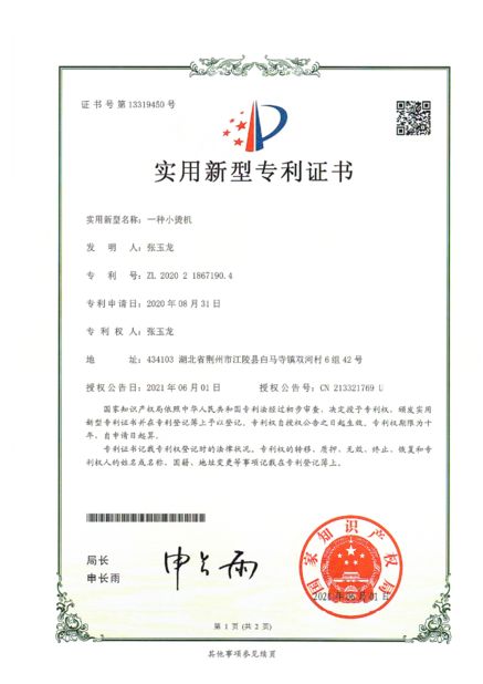 Standard:Utility Model Patent Certificate Number:ZL 202021867190.4 Issue Date:2021-06-01 Issued By:National Intellectual Property Administration |